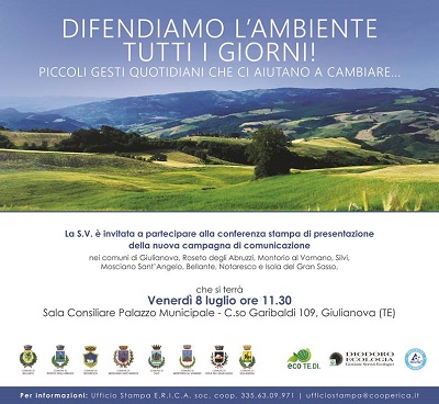 GIULIANOVA (TE) – Venerdì 8 luglio alle 11,30 nella sala consiliare del Palazzo municipale di Giulianova, in corso Garibaldi 109, è in programma la conferenza stampa di presentazione della campagna di sensibilizzazione ambientale “Difendiamo l’Ambiente tutti i giorni!”, per incentivare il riciclo di carta, cartone e confezioni Tetra Pak nonché promuovere una corretta raccolta differenziata di tutti i rifiuti.