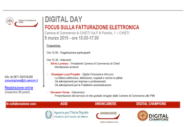 Il Digital Day si svolgerà così: introduzione generale di Silvio Di Lorenzo, con panoramica sull’accordo nazionale tra l’Agenzia per l’Italia Digitale della Presidenza del Consiglio dei Ministri, i Digital Champions e Unioncamere nazionale; poi Giuseppe Luca Propato, Digital Champion Abruzzo, tratterà i temi della fatturazione elettronica: definizione, requisiti e norme, adempimenti per imprese, professionisti e anche per le pubbliche amministrazioni. Interverrà poi Giovanni Verna di Infocamere Scpa, il quale presenterà il servizio on line (gratuito) erogato dalle Camere di Commercio alle PMI. Per le Iscrizioni on line, si può visitare il sito www.ch.camcom.it.