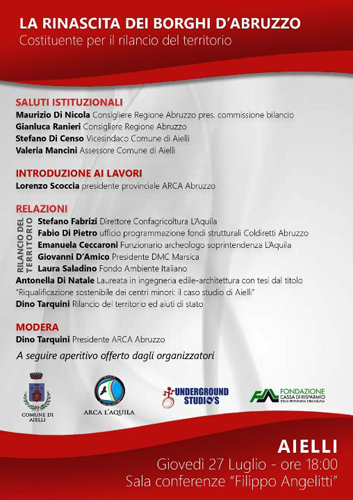 AIELLI (AQ) – L’associazione culturale ARCA ABRUZZO, in collaborazione con il Comune di Aielli, la Fondazione Carispaq e l’Underground Studios, organizza un convegno in merito a “La rinascita dei borghi d’Abruzzo – Costituente per il rilancio del territorio” ad Aielli presso la Sala Conferenze Filippo Angelitti, in data 27 luglio, ore 18.00.