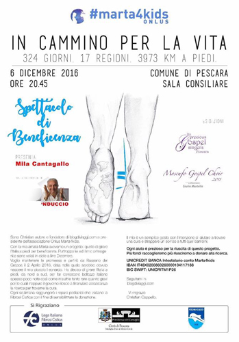 Domani, martedì 6 dicembre, dalle 20.45 la sua causa sarà sposata dalla città di Pescara, grazie all’evento “Il cammino per la vita”, promosso dalla Presidenza del Consiglio Comunale e a cura della Onlus #Marta4kids e dai sostenitori abruzzesi del progetto, con uno spettacolo che si terrà in Sala Consiliare, presentato oggi insieme alla storia di Christian raccontata giorno per giorno nel suo blog di viaggi: http://blogdiviaggi.com .