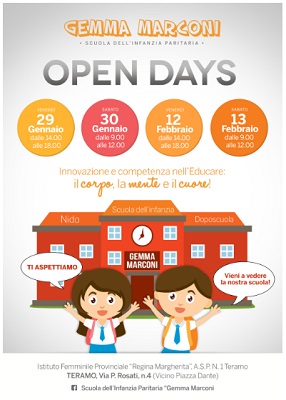 TERAMO – Al via gli “Open Days” della Scuola dell’Infanzia “Gemma Marconi” di Teramo. Domani pomeriggio (dalle 14.00 alle 18.00) e sabato mattina (dalle 9.00 alle 12.00), l’Istituto di via P. Rosati 4 (vicino Piazza Dante) “aprirà le porte” a genitori e famiglie che potranno così visitare la struttura e conoscere servizi e offerta formativa della scuola. Le attività di accoglienza e informazione saranno gestite dal dirigente scolastico e dagli insegnanti, sarà inoltre allestito uno spazio per le attività ricreative rivolte ai bambini che accompagneranno i loro genitori.