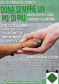 “In questo momento di grave crisi economica e conseguente taglio alla spesa pubblica, riteniamo sia opportuno contribuire attraverso la solidarietà per assicurare il funzionamento di una struttura, quale il canile comunale di Lanciano, che si fa carico del sostentamento di decine di cani senza padrone. A partire da oggi, e fino al 26 Marzo sarà possibile portare cibo per cani, coperte e medicinali specifici per cani presso la sede lancianese di CasaPound Italia, sita in via Cavour n.1 ed aperta dal Mercoledì al Venerdì dalle 18 alle 19. Ulteriori punti di raccolta saranno anche allestiti presso gli studi di veterinari e negozi di animali della città aderenti all’iniziativa. Invitiamo la popolazione a partecipare, affinchè il senso di solidarietà civica già mostrato più volte dai frentani possa esprimersi ancora una volta questa volta a sostegno degli animali, ed a supporto di quanti si impegnano nella loro tutela”.