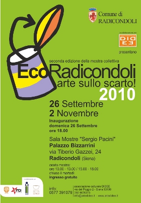 Giunta alla seconda edizione ,la mostra sul riciclaggio e sul risparmio energetico di Radicondoli è organizzata dall’amministrazione comunale in collaborazione con l’associazione Didee, il Punto Informazioni Turistiche e con la Proloco, presso la sala mostre “Sergio Pacini” di Palazzo Bizzarrini. L’esposizione, che resterà aperta fino al 2 novembre, raccoglie opere di gusto innovativo, realizzate con materiali di recupero, ideate e prodotte da artisti fuori dal comune, per creatività e originalità: gli artisti trasmetteranno il proprio bagaglio di esperienza, la propria sensibilità, la propria magia del sentire il mondo circostante.