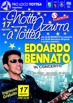 TOTTEA (TE) – Sarà Edoardo Bennato ad animare la Notte Azzurra a Tottea (Te) il prossimo 17 agosto. L’evento, ad ingresso gratuito, è organizzato dalla Pro loco di Tottea in collaborazione con la Top Agency Group di Luigi Chiucconi.