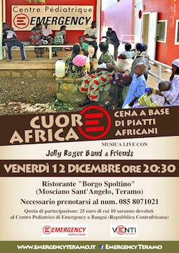 MOSCIANO SANT’ANGELO (TE) – Venerdì 12 dicembre alle ore 20.30 presso il Ristorante “Borgo Spoltino” a Mosciano Sant’Angelo, il gruppo Emergency Teramo, ha organizzato una cena solidale dal titolo “Cuore Africa”. Tema della serata sarà l’Africa con il suo calore, il suo cibo e i suoi colori.