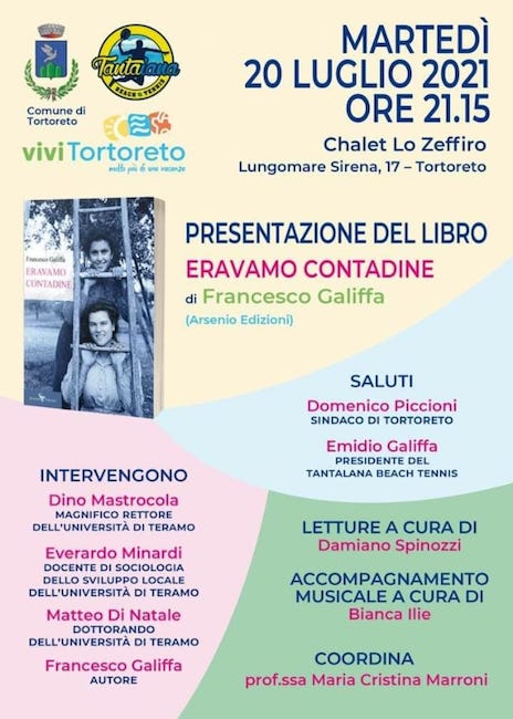 TORTORETO – Martedì 20 luglio alle 21.15 allo chalet Lo Zeffiro di Tortoreto Lido (lungomare Sirena 17) verrà presentato il libro Eravamo contadine (Arsenio Edizioni), nuovo lavoro di Francesco Galiffa che omaggia la civiltà contadina della Val Vibrata del primo Novecento. Questo scrive Maria Rosaria la Morgia nella prefazione: «Sono venticinque le donne della Val Vibrata, figlie di mezzadri o di piccoli proprietari, che si raccontano nel libro di Francesco Galiffa. Storie di vita che attraversano buona parte del ’900, consumato in un angolo d’Abruzzo, ma significative di una cultura che non possiamo circoscrivere all’interno dei confini di un territorio. Il titolo indica il percorso interpretativo scelto dall’autore e sottintende la polivocalità di una narrazione che ambisce a tracciare una storia collettiva sia pure in ambito locale. È una vita in gran parte piena di fatiche e di sacrifici quella che emerge dalle testimonianze raccolte e riordinate in capitoli che seguono le stagioni della vita (infanzia, fidanzamento, matrimonio, maternità) e il lavoro, in campagna e in casa».