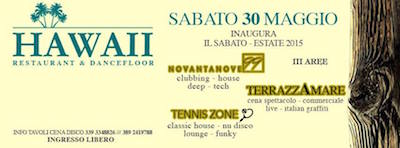 L’inaugurazione delle serate di Hawaii sarà oggi, sabato 30 Maggio sulla “TerrazzAmare” dalle ore 21 in poi: ci si potrà lasciar andare al piacere di ‘dinner’ e ‘after dinner’ sotto le stelle con il format “Tuttoilrestoènoia cena spettacolo” in collaborazione con “Quelli che Pescaresi…”, quindi Stefano D’Alberto accompagnato dalla musica di djs d’autore: Paolo Sala, Pino Morelli, Alex Cipo e Jonathan Pacchione; a guidare la serata ci sarà il vocal JB JanBurrasca.