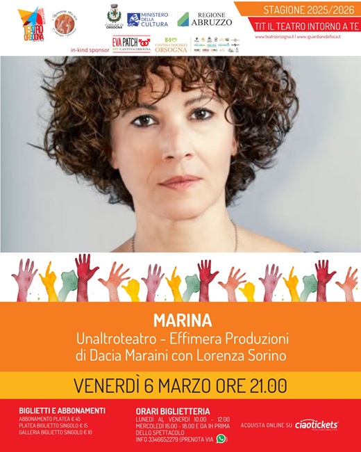 Prosegue al Teatro Camillo De Nardis di Orsogna la rassegna TIT – “Il Teatro Intorno a Te”, inserita nella stagione teatrale curata da I Guardiani dell’Oca con la direzione artistica di Zenone Benedetto, in collaborazione con il Comune di Orsogna. Venerdì 6 marzo, alle ore 21, andrà in scena “Marina”, monologo scritto e interpretato da Lorenza Sorino e prodotto da Unaltroteatro – Effimera Produzioni.