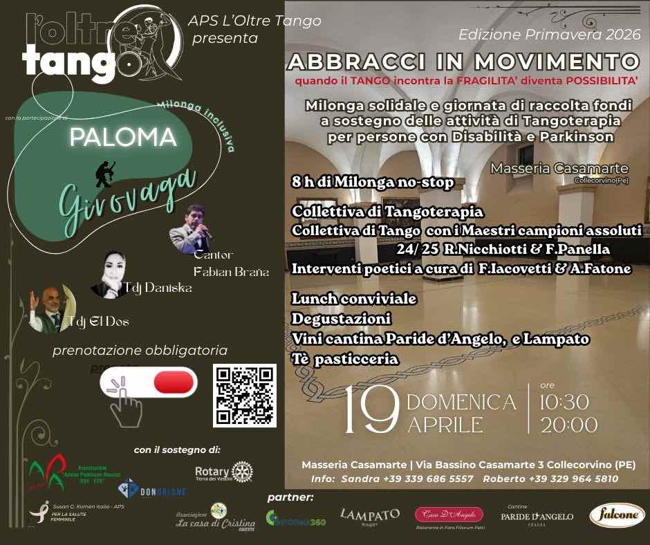 Una giornata interamente dedicata alla solidarietà, alla cultura e alla forza terapeutica dell’abbraccio. È questo lo spirito di “Abbracci in movimento”, l’evento promosso dall’associazione L’Oltre Tango che si terrà domenica 19 aprile 2026, dalle 10.30 alle 20.00, nella splendida cornice della Masseria Casamarte di Collecorvino (PE).