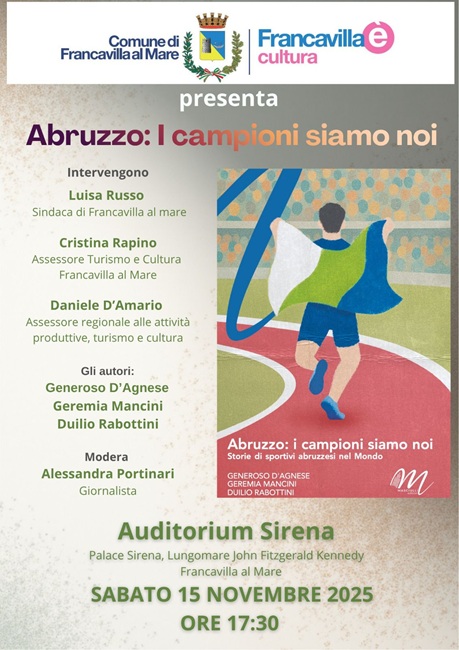 Francavilla al Mare si prepara a rendere omaggio ai suoi figli più illustri, quelli che hanno portato il nome dell’Abruzzo nel mondo attraverso lo sport. Sabato 15 novembre 2025, alle ore 17:30, l’Auditorium Sirena ospiterà la presentazione del libro Abruzzo: i campioni siamo noi – Storie di sportivi abruzzesi nel mondo, scritto da Generoso D’Agnese, Geremia Mancini e Duilio Rabottini, edito da Masciulli Edizioni.