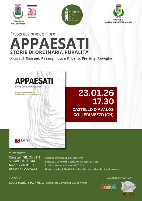 Un podcast che diventa un libro per raccontare le aree interne, il loro declino e le loro possibilità di rinascita: questa in sintesi l’essenza di Appaesàti. Storia di ordinaria ruralità, a cura di Rossano Pazzagli, Luca Di Lello e Pierluigi Reveglia, pubblicato da Radici edizioni. Il libro sarà presentato venerdì 23 gennaio alle 17,30 a Colledimezzo (Ch), al Castello d’Avalos. L’evento, promosso dalla Scuola dei piccoli Comuni di Castiglione Messer Marino (Ch), è organizzato dal Comune di Colledimezzo (Ch) con il supporto della locale Pro Loco e della cooperativa di comunità Colle Ospitale.