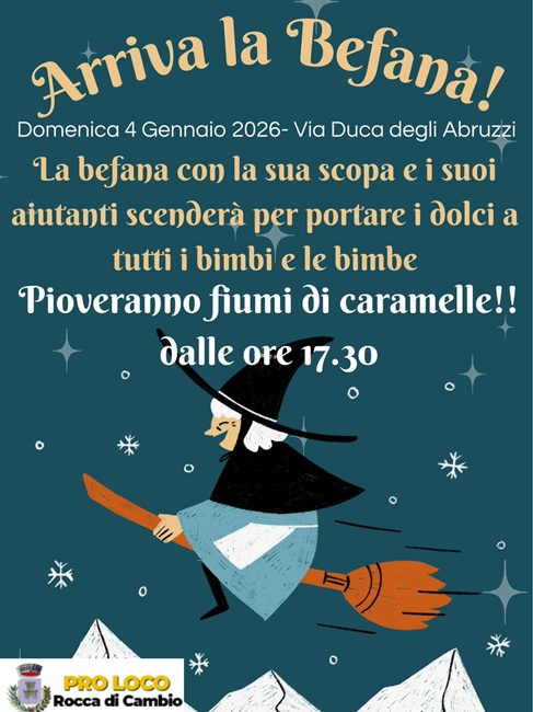 Rocca di Cambio si prepara a vivere uno degli appuntamenti più attesi dai più piccoli. Domenica 4 gennaio 2026, a partire dalle 17.30, la tradizionale Befana farà il suo arrivo in Via Duca degli Abruzzi, portando con sé la magia delle feste e un carico speciale di dolciumi.