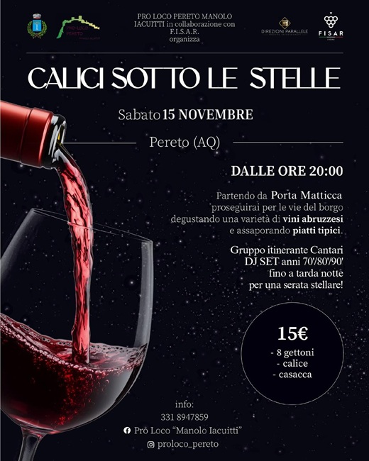 Sabato 15 novembre 2025 il borgo di Pereto si illuminerà con la nuova edizione di “Calici sotto le stelle”, l’evento organizzato dalla Pro Loco Manolo Iacuitti in collaborazione con F.I.S.A.R.. A partire dalle ore 20.00, il centro storico diventerà un percorso di gusto e convivialità, dove i visitatori potranno degustare una selezione di vini abruzzesi e assaporare piatti tipici della tradizione locale.