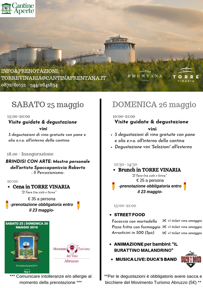 Sabato 25 e domenica 26 Maggio anche la Cantina Frentana di Rocca San Giovanni, in provincia di Chieti, partecipa a Cantine Aperte 2019. Il programma Sabato 25 maggio:
