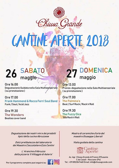 In occasione di Cantine aperte 2018 anche l’Azienda Chiusa grande di Nocciano (PE) aderisce all’iniziativa con visite e degustazioni. Programma: Venerdì 26 maggio a partire
