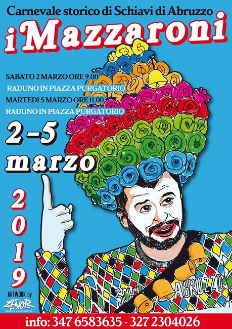 Sabato 2 e martedì 5 marzo grande festa di Carnevale a Schiavi di Abruzzo, in provincia di Chieti, borgo ricco di storia, cultura e tradizioni che ogni anno propone un’antica festa con “I Mazzaroni” (l’mazzaroun in dialetto locale). I Mazzaroni sono i giovani del paese, che indossano un caratteristico copricapo, il Cimiero (C’mir) di varie forme, ricoperto di colorati fiori di carta e nastri (zagarelle). Il gruppo è capeggiato dal Pulcinella, figura centrale del carnevale schiavese, contraddistinto dalla presenza della “mazza” (sagliocca), simbolo di potere, di semidivinità e di rinnovamento vegetale. Questa allegra combriccola visita tutte le case per la rituale questua ricevendo dolci, vino e insaccati in cambio di canti e balli della tradizione. Durante l’intera giornata del carnevale si susseguono canti e balli, soprattutto viene proposta “la spallata”, ballo tipico di Schiavi di Abruzzo, danza salle origini antichissime che presenta una struttura complessa, con scambi ed avvicinamenti delle coppie disposte in file parallele, frontali o in cerchi.