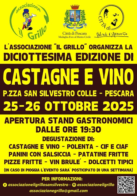 L’autunno abruzzese torna a profumare di castagne, vin brulé e allegria grazie a uno degli appuntamenti più attesi della stagione: la 18ª edizione di “Castagne e Vino”, organizzata dall’Associazione Il Grillo. Due serate all’insegna del gusto, della musica e della convivialità, nella suggestiva cornice di Piazza San Silvestro Colle, sabato 25 e domenica 26 ottobre 2025, a partire dalle ore 19:30.