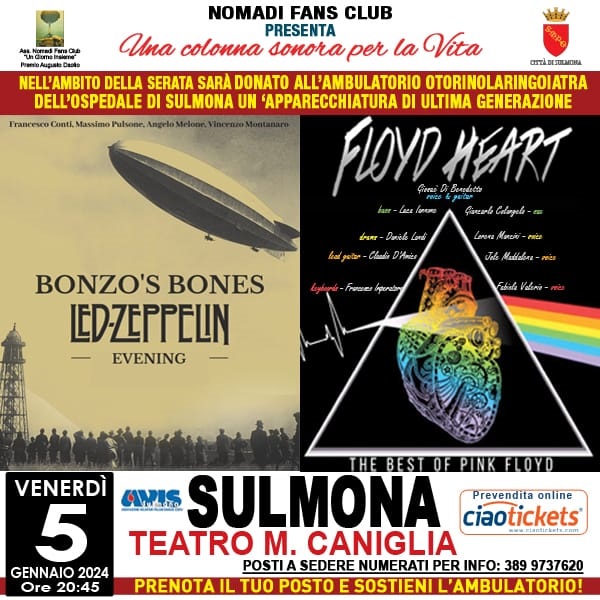 Con un doppio concerto tributo alla musica dei Led Zeppelin e dei Pink Floyd si conclude venerdì 5 gennaio 2024 a Sulmona (L’Aquila) l’edizione 2023 di “Una colonna sonora per la vita”. Appuntamento a partire dalle ore 20.45, al Teatro comunale di Sulmona (L’Aquila). Protagoniste sul palco due band: i Bonzo Bone’s e i Floyd Heart.