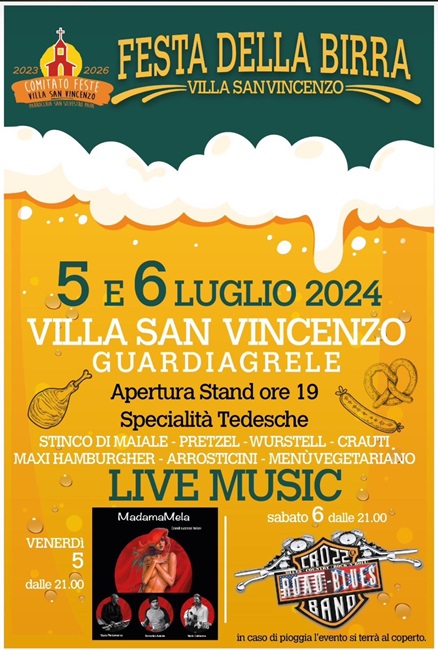 Venerdì 5 e sabato 6 luglio Festa della birra a Villa San Vincenzo a Guardiagrele. Tutte le sere, a partire dalle 19.30, presso gli stand gastronomici si potrà degustare specialità tedesche e non. Il tutto annaffiato da fiumi di spumeggiante birra. Non mancherà la musica ad allietare l’atmosfera- Venerdì sarà quella di ,Madama Mela, sabato quella della Cross Road Blues Band.