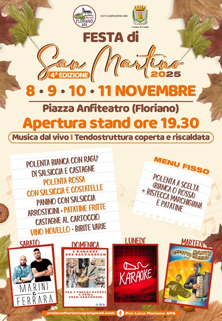 Dal 8 all’11 novembre 2025, Piazza Anfiteatro di Floriano si trasforma in un vivace palcoscenico di sapori e musica per la 4ª edizione della Festa di San Martino, organizzata dalla Pro Loco Floriano APS. L’evento, ormai diventato appuntamento fisso nel calendario autunnale abruzzese, promette quattro serate all’insegna della convivialità, della buona cucina e dell’intrattenimento.