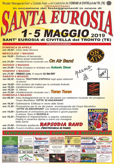 Dal 1° al 5 maggio 2019 a Sant’Eurosia di Civitella del Tronto, in provincia di Teramo, torna l’appuntamento coni festeggiamenti in onore della patroa, organizzati dalla Pro Loco “Montagna dei Fiori” e il Comitato Festa, con il patrocinio del Comune di Civitella del Tronto. Cinque giorni con intrattenimento, musica dal vivo, raduno dei trattori d’epoca, animazione per bambini, gara di ruzzola, fuochi d’artific e molto altro.