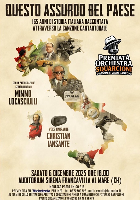 Un viaggio nella storia per riflettere sui momenti salienti che hanno segnato l’Italia. Una macchina del tempo (dall’unità risorgimentale proclamata nel 1861 ai giorni nostri) a spasso tra le due guerre mondiali, il boom economico, gli anni di piombo. Senza dimenticare i fenomeni migratori (quando a cercare un mondo migliore erano gli italiani) e gli anni del Pentapartito, Tangentopoli, le stragi di mafia e il nuovo millennio tra la nascita dell’euro e lo sliding doors delle Torri Gemelle. E’ su questo frastagliato e scomodo crinale che si muoverà lo spettacolo musicale “Questo assurdo Belpaese”, in programma sabato 6 dicembre alle ore 18:00 presso l’Auditorium Sirena di Francavilla al Mare, arrangiato e suonato dalla Premiata Orchestra Squarcioni – Stefano Falconio voce e chitarra, Marianna Capone e Valeria Zulli coriste, Maurizio Paludi chitarra, Pierpaolo Catena basso, Fabrizio Palermo tastiere, Aldo Leandro batteria, Gabriel Rosati tromba, Manuel Trabucco sax e Vincenzo Di Santo percussionista – e raccontato dall’inconfondibile voce dell’attore e doppiatore Christian Iansante.
