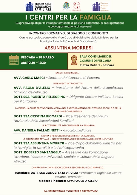 Un momento di dialogo, formazione e confronto dedicato al futuro delle politiche familiari. È l’obiettivo dell’incontro “I Centri per la Famiglia”, in programma sabato 28 marzo dalle 10:30 alle 12:30 nella sala consiliare del Comune di Pescara, promosso dal Forum delle Associazioni Familiari dell’Abruzzo con il patrocinio del Comune e in collaborazione con il Forum nazionale.