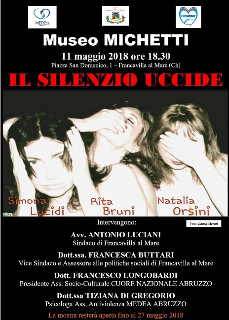 La mostra d’arte “Il silenzio uccide ” è nata da una forte volontà delle artiste – Natalia Orsini,di Pescara, Simona Lucidi e Rita Bruni, di San Benedetto del Tronto – che nonostante le differenze tecniche pittoriche e fotografiche, hanno in comune un unico scopo: denunciare attraverso l’arte, l’ormai agghiacciante argomento della violenza sulle donne e non solo, che sui media sentiamo troppo spesso citare.