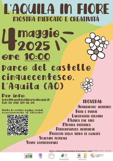 Domenica 4 maggio. dalle 10 alle 20 nella suggestiva cornice del parco del castello cinquecentesco di L’Aquila, si rinnova l’appuntamento con L’Aquila in fiore, la mostra mercato e creatività che celebra la primavera e la bellezza del territorio aquilano.