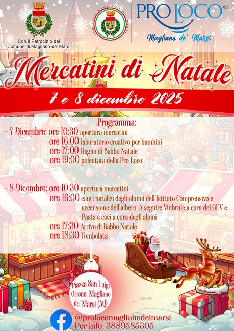 La Pro Loco Magliano de’ Marsi, è lieta di annunciare l’edizione 2025 dei Mercatini di Nata: tra gusto e tradizionele, in programma nei giorni 7 e 8 dicembre in Piazza San Luigi Orione.