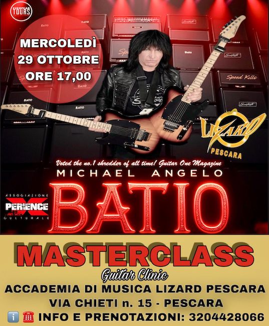 Un evento unico per gli appassionati di chitarra elettrica: Michael Angelo Batio, celebre “shredder” e attuale chitarrista dei Manowar, sarà ospite della Accademia di Musica Lizard di Pescara per una masterclass mercoledì 29 ottobre alle ore 17:00.