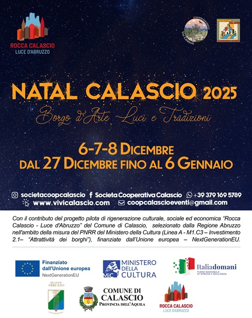 Il progetto rientra nel programma di rigenerazione culturale, sociale ed economica “Rocca Calascio – Luce d’Abruzzo”, promosso dal Comune di Calascio e selezionato dalla Regione Abruzzo nell’ambito della misura PNRR del Ministero della Cultura (Linea A – M1.C3 – Investimento 2.1 “Attrattività dei borghi”), finanziato dall’Unione europea – NextGenerationEU.