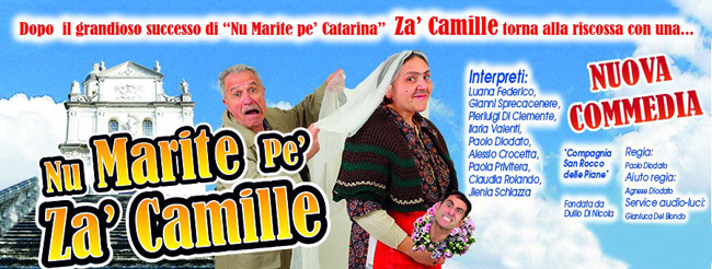 Giovedì 31 maggio e venerdì 1 giugno torna al Teatro Massimo di Pescara Za Camilla di Sgarrone, la fortunata protagonista della celebre commedia abruzzese “Nu marite pe Catarina”, andato recentemente in scena l’11 marzo. Un nuovo ed esilarante spettacolo dal titolo “Nu Marite pe’ Za’ Camille” in cui sarà lei, questa volta, a cercare un nuovo sposo innescando una serie imprevista di comicissimi incontri, incidenti, apparizioni fino al sorprendente e spassoso finale. Maschera comica, nata dall’ingegno artistico dell’attrice Luana Federico ed entrata da venticinque anni nell’ immaginario popolare abruzzese, Za Camilla è pronta nuovamente a coinvolgere in due ore di puro divertimento. Lo spettacolo è messo in scena dalla Compagnia San Rocco Delle Piane.