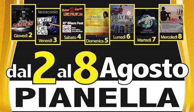 Si parte dal 2 agosto in compagnia della musica dei Litfiba eseguita dai Cafè Mexcal passando per quella dei Pink Floyd con i Terzacorsia il 3 agosto, quindi Giorgia, Max Pezzali, Ligabue finoe a Rino Gaetano. Serata speciale il 4 con l’undicesima edizione della festa dei Bikers di Pianella. Andiamo dunque a vedere il riepilogo dei concerti presenti ricordando che gli stand saranno aperti dalle 19 mentre la musica partirà intorno alle 21:30. Ingresso gratuito dall’evento.