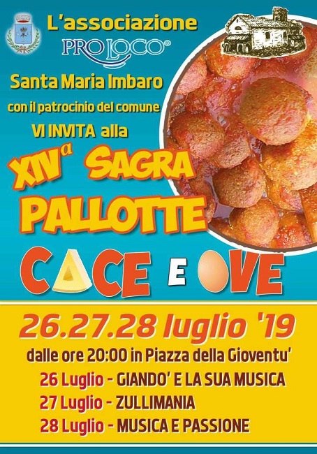 Dal 26 al 28 luglio a Santa Maria Imbaro, in provincia di Chieti, torna l’appuntamento con la Sagra “Pallotte Cace e Ove” , giunta quest’anno alla sua quattordicesima edizione. L’evento si terrà in Piazza della Gioventù, che per tre sere sarà palcoscenico del gusto e del divertimento.