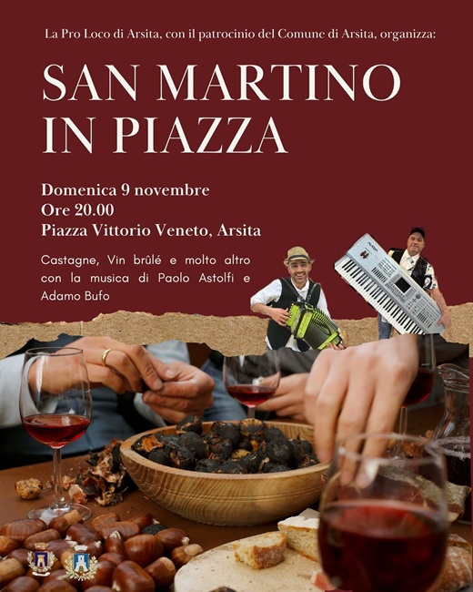 Domenica 9 novembre 2025, a partire dalle ore 20:00, Piazza Vittorio Veneto si accenderà di profumi, suoni e tradizione per l’evento San Martino in Piazza, organizzato dalla Pro Loco di Arsita con il patrocinio del Comune di Arsita.
