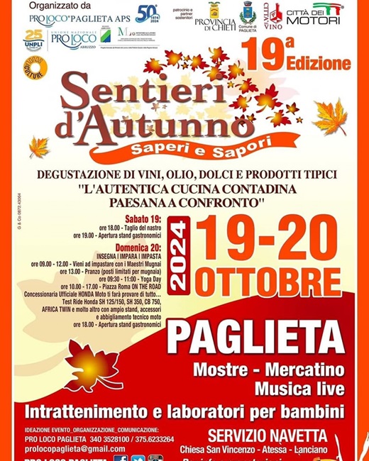Sabato 19 e domenica 20 ottobre a Paglieta, in provincia di Chieti, torna l’appuntamento con “Sentieri d’Autunno”, il percorso enogastronomico all’interno del centro storico del paese. La manifestazione, organizzata dalla Pro Loco di Paglieta, in collaborazione con l’Amministrazione Comunale, è giunta alla sua diciottesima edizione.