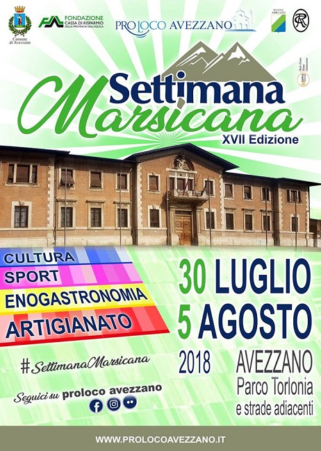Da lunedì 30 luglio a domenica 5 agosto torna ad Avezzano, nella cornice di Palazzo Terlonia, l’appuntamento con la Settimana marsicana, giunta quest’anno alla sua diciassettesima edizione. Obiettivo della manifestazione, come empre, quello di porre al centro la cultura, lo spettacolo, lo sport, l’artigianato, l’enogastronomia, lo street food, le mostre fotografiche e l’arte.
