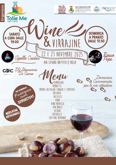 L’autunno abruzzese si accende di gusto e convivialità con il ritorno di Wine & Virrajine, l’evento organizzato dalla Pro Loco “Tolle Me” con il patrocinio del Comune di Tollo, UMPI e Pro Loco. Due giornate, sabato 22 novembre e domenica 23 novembre 2025, che trasformeranno Via Cesare Battisti in un palcoscenico di sapori, musica e tradizioni.
