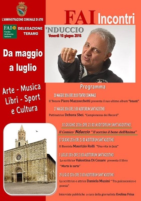ATRI (TE) – E’ in programma per domani, venerdì 10 giugno 2016, il terzo appuntamento del FAI Incontri a cura della delegazione FAI Teramo e dell’Amministrazione comunale di Atri. Nell’auditorium Sant’Agostino, alle 21, ci sarà il noto comico abruzzese Germano D’Aurelio, in arte ‘Nduccio, che si racconterà nel corso di una intervista pubblica con la giornalista Evelina Frisa.