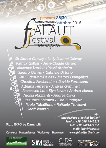 Il Falaut Festival si è posto, sin dalla prima edizione tenutasi nel 2005 a Cernusco sul Naviglio, come punto di riferimento mondiale. Il Festival – organizzato dall’Associazione Flautisti Italiani in collaborazione con il Conservatorio “L. D’Annunzio” e la Società del Teatro e della Musica di Pescara – è una manifestazione dedicata a 360 gradi al flauto traverso, della durata di tre giorni, articolata in masterclass, concerti, showcase, esposizioni, conferenze, seminari, workshop. Kermesse che vede la partecipazione di circa venti flautisti professionisti riconosciuti dalla critica internazionale e dal pubblico tra le personalità del settore più importanti al mondo. Parteciperanno musicologi, studiosi e compositori del settore per affrontare gli aspetti storici, teorici e tecnici.