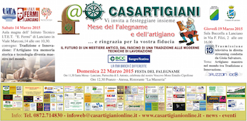 LANCIANO (CH) – I prossimi 14, 19 e 22 marzo a Lanciano “Festa del falegname e dell’artigiano” a cura dell’Associazione Casartigiani Abruzzo e con il patrocinio della Regione Abruzzo e quello del Comune di Lanciano. Previste tre giornate con incontri formativi e informativi, stage organizzati con l’Istituto E. Fermi di Lanciano, l’Università Gabriele D’Annunzio di Pescara nel “Corso di Laurea in Economia e Commercio”, esperti di Internazionalizzazione, professionisti della Stampa 3D esperti della sicurezza sul lavoro e con gli Artigiani titolari di partita Iva presenti sul territorio abruzzese. Stage per stimolare e poi concretizzare attività di formazione e informazione che verranno presentate durante convegni e trasmissioni televisive.