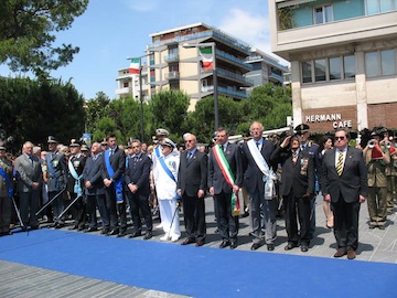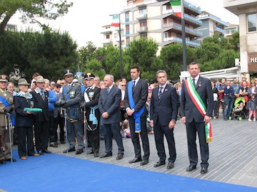 Tante le autorità presenti, oltre al sindaco di Pescara, Luigi Albore Mascia, tra gli altri c’erano anche gli assessori Vincenzo Serraiocco, Nicola Ricotta ed Eugenio Seccia, il vicesindaco Berardino Fiorilli, l’assessore regionale Carlo Masci, il Presidente del Consiglio regionale Nazario Pagano, il Presidente della Provincia di Pescara Guerino Testa, il vicepresidente del Consiglio comunale Gianni Santilli, il consigliere Vincenzo Dogali, il Presidente della Camera di Commercio Daniele Becci, il Presidente della Fondazione PescarAbruzzo Nicola Mattoscio, il Prefetto Vincenzo D’Antuono, il questore Paolo Passamonti e tutte le Autorità militari. Ad aprire la manifestazione è stata la Fanfara dei Bersaglieri ‘La Dannunziana’ giunta in piazza dal lato sud e che ha anticipato l’ingresso dei Labari delle Associazioni Combattentistiche e d’Arma e dei Gonfaloni del Comune e della Provincia di Pescara.