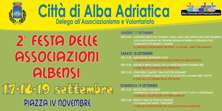 ALBA ADRIATICA (TE) – La seconda edizione della Festa delle associazioni di Alba Adriatica, si svolgerà dal 17 al 19 settembre 2010 in piazza IV Novembre.