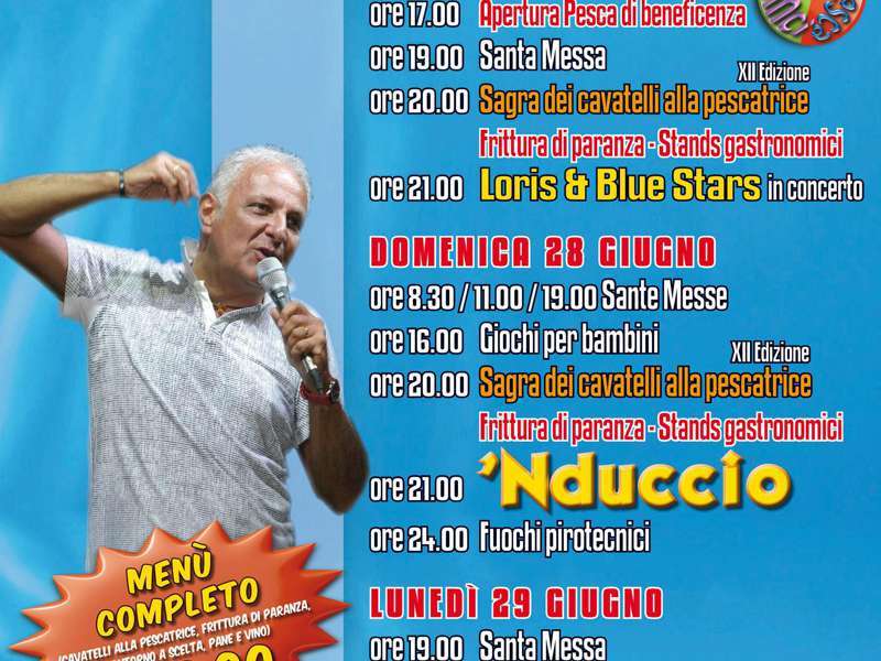 Si parte nel pomeriggio di Sabato 27 Giugno alle 16.00 con i giochi gonfiabili per bambini e ragazzi e l’apertura della Pesca di Beneficienza alle 17.00. Si prosegue con la Santa Messa alle 19.00 e a seguire la cena in piazza con il Menù Sagra e le altre proposte offerte degli stand gastronomici (panini, arrosticini, patatine) e dal banco dolci (scrippelle e altri dolci tipici). Ad allietare la serata il concerto di Loris e Blue Stars.