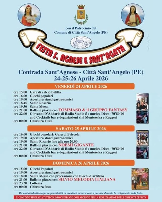 CITTA’ SANT’ANGELO – La Contrada Sant’Agnese di Città Sant’Angelo torna ad aprire le sue strade alla festa, alla musica e alla devozione con la Festa di Sant’Agnese e Sant’Agata 2026, tre giorni che profumano di tradizione e di primavera, tra giochi popolari, stand gastronomici, celebrazioni religiose e serate danzanti sotto le stelle.