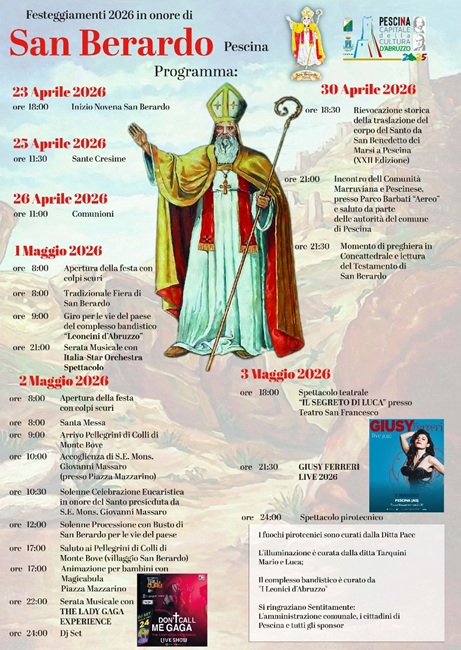 PESCINA – La città di Pescina si prepara a vivere uno dei momenti più sentiti della propria tradizione religiosa e comunitaria: i Festeggiamenti 2026 in onore di San Berardo, Patrono della Marsica. Un programma ricco, articolato e profondamente identitario accompagnerà fedeli, cittadini e visitatori dal 23 aprile al 3 maggio, intrecciando spiritualità, storia, musica e partecipazione popolare.