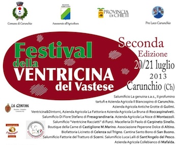 CARUNCHIO (CH) – Il 20 e 21 luglio 2013 a Carunchio si terrà la seconda edizione del Festival della Ventricina del Vastese.L’evento gastronomico è promosso dal Comune di Carunchio, Pro Loco Carunchio, Salumificio La Genuina sas e Azienda Agricola Il Biancospino, con il patrocinio dell’Assessorato all’Agricoltura della Regione Abruzzo.
