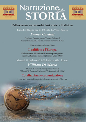 La manifestazione inizierà lunedì 18 luglio alle ore 21.00 con un ospite d’eccezione, Franco Cardini, Professore Emerito presso l’Istituto Italiano di Scienze Umane della Scuola Normale Superiore di Pisa, il quale presenterà il suo nuovo libro Il califfato e l’Europa – Dalle crociate all’ISIS: mille anni di paci e guerre, scambi, alleanze e massacri, (Torino, Utet, 2016). Con questo volume l’insigne studioso ha ottenuto il primo posto al “Premio di Saggistica Città delle Rose” proprio nello scorso mese di maggio.