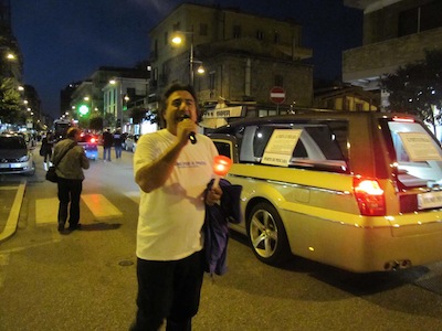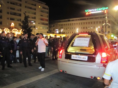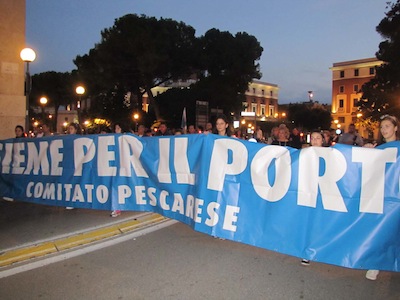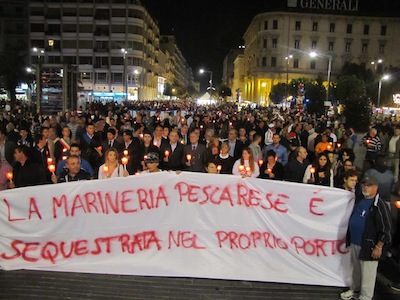 E c’erano balneatori, guidati da Riccardo Padovano, esponenti della Confcommercio, le Associazioni Comitato No Rifiuti a Fosso Grande e Terra Nostra, e centinaia di cittadini. Il corteo è partito, come previsto, poco dopo le 18 dall’area antistante la sede dell’Associazione Marinai d’Italia, dinanzi al corteo un carro funebre con una bara a simboleggiare il porto morto, dietro gli striscioni della marineria e le Istituzioni. Lentamente il corteo, alla luce delle fiaccole, si è avviato lungo via Paolucci, piazza Italia, con una breve sosta dinanzi alla Prefettura, rappresentanza del Governo sul territorio, quindi via Firenze, via Venezia, via Nicola Fabrizi, dove pian piano altra gente è uscita dai negozi per accompagnare il corteo, mentre la marineria ricordava al microfono le ragioni della manifestazione, quindi l’arrivo in piazza Salotto, dove sono saliti sul palco i rappresentanti della marineria, Padovano, Massimo Camplone, Mimmo Grosso, Francesco Scordella, Giovanni Verzulli, che hanno voluto al loro fianco il sindaco Albore Mascia, il Presidente Testa, l’assessore Masci, il vicesindaco di San Giovanni Teatino Di Clemente e il sindaco di Abbateggio Di Marco.